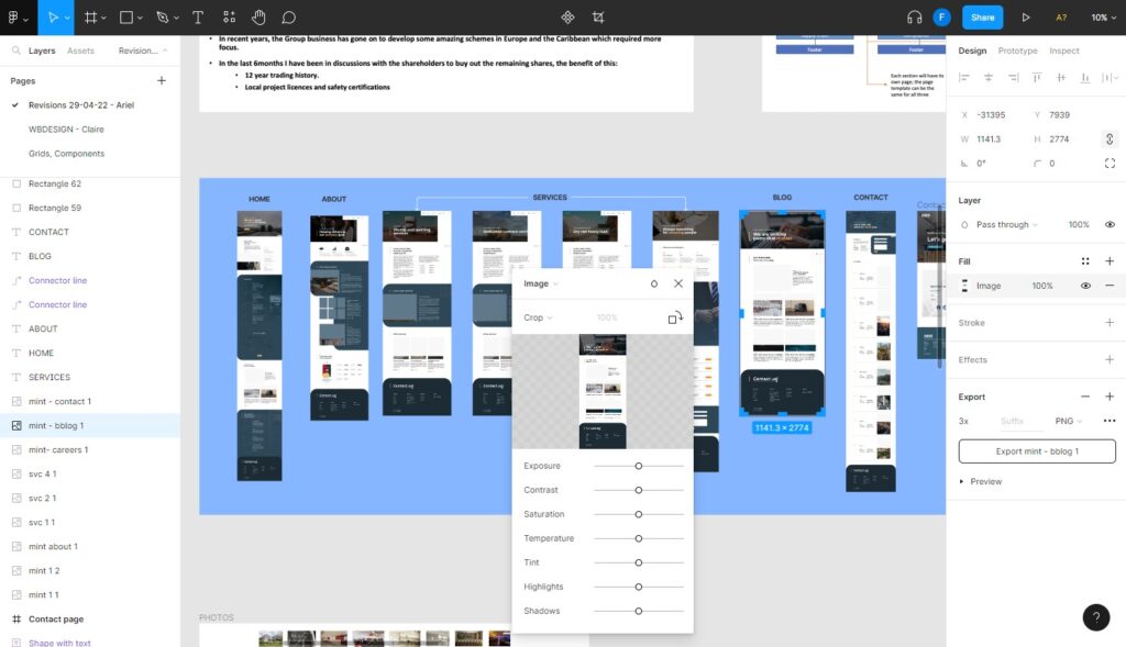 With Figma, you have a lot of traditional design tool functionality such as layers, image manipulation, better font control.